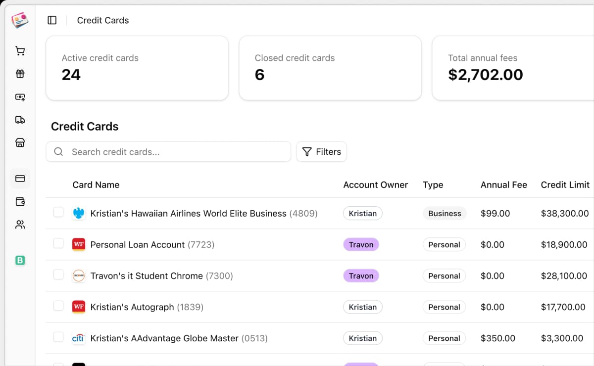 Monitor your credit card collection, annual fees, and renewal dates across multiple card owners.