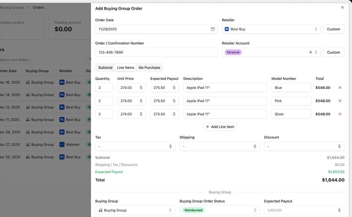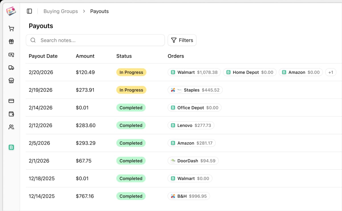 Track your buying group, gift card resale, and cashback orders in one place.