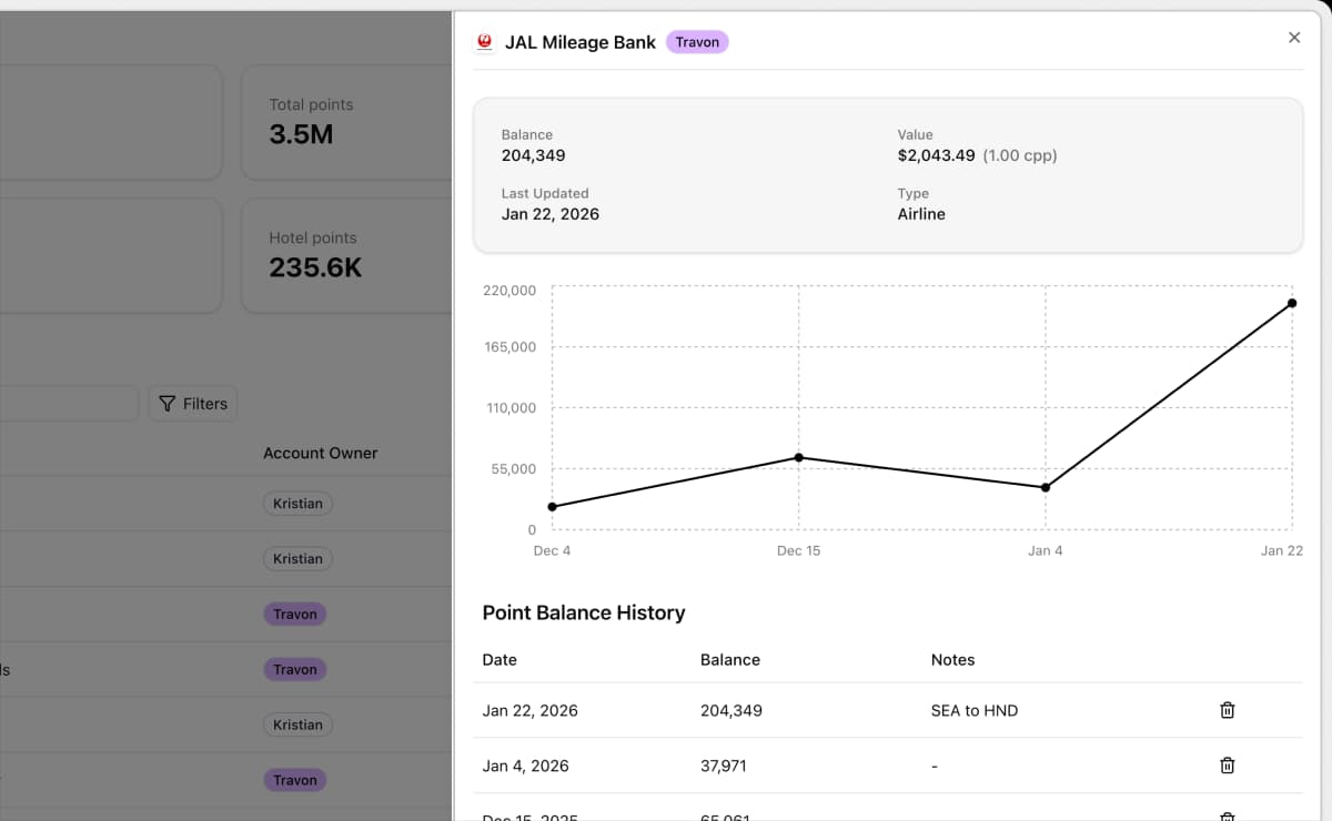 Keep a historical log of your point balances across 50+ hotel, airline, and credit card programs.